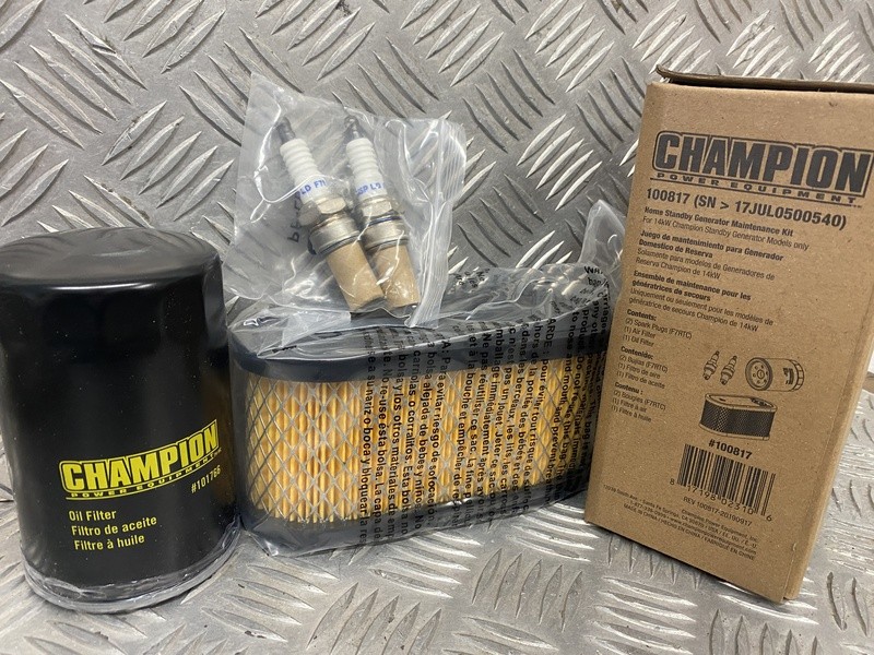 The Champion Power Equipment 100817 14kW Home Standby Generator Maintenance Kit includes everything you need to extend the life and function of your generator. The kit includes two spark plugs (F7RTC), an air filter and an oil filter.